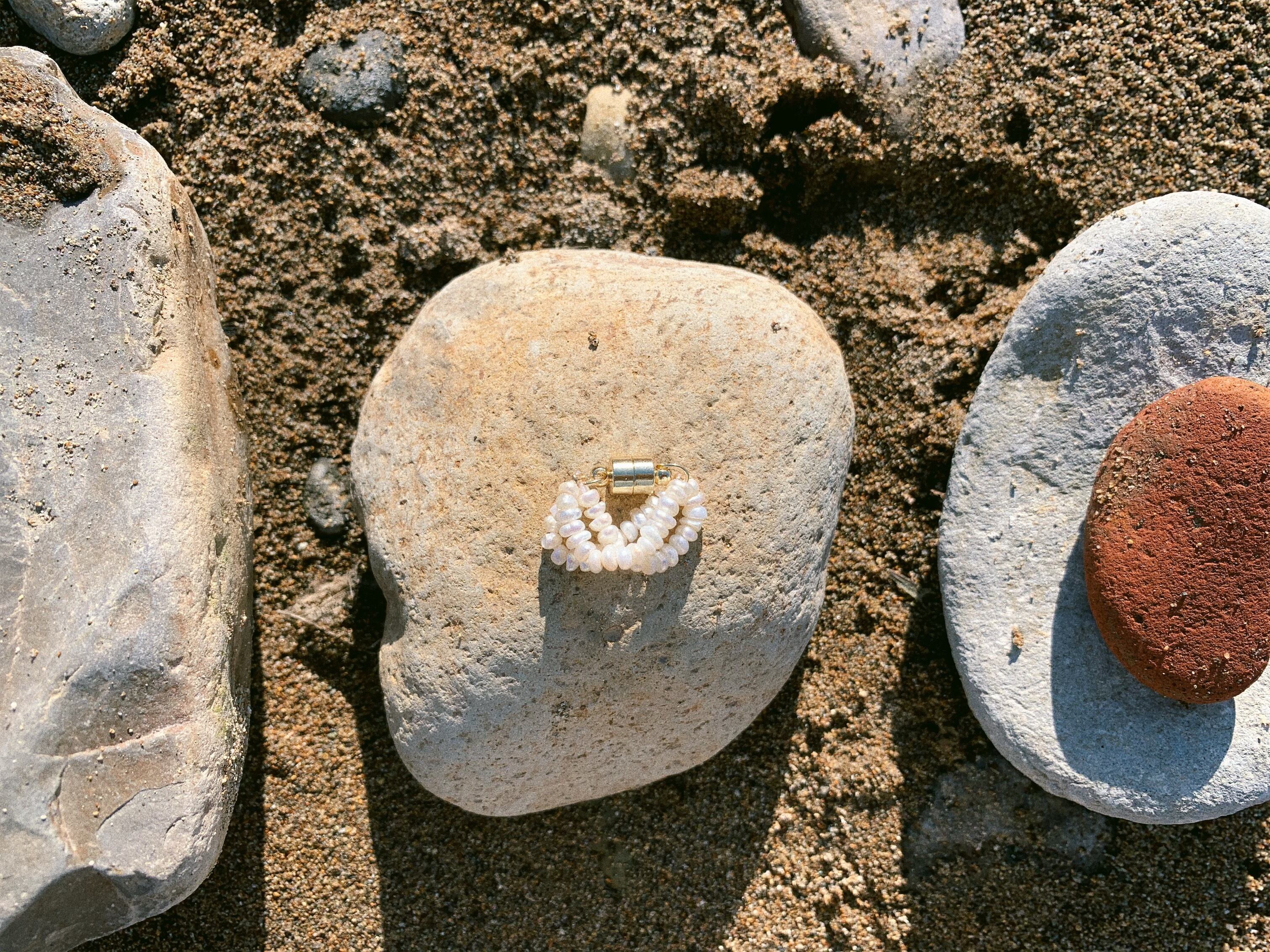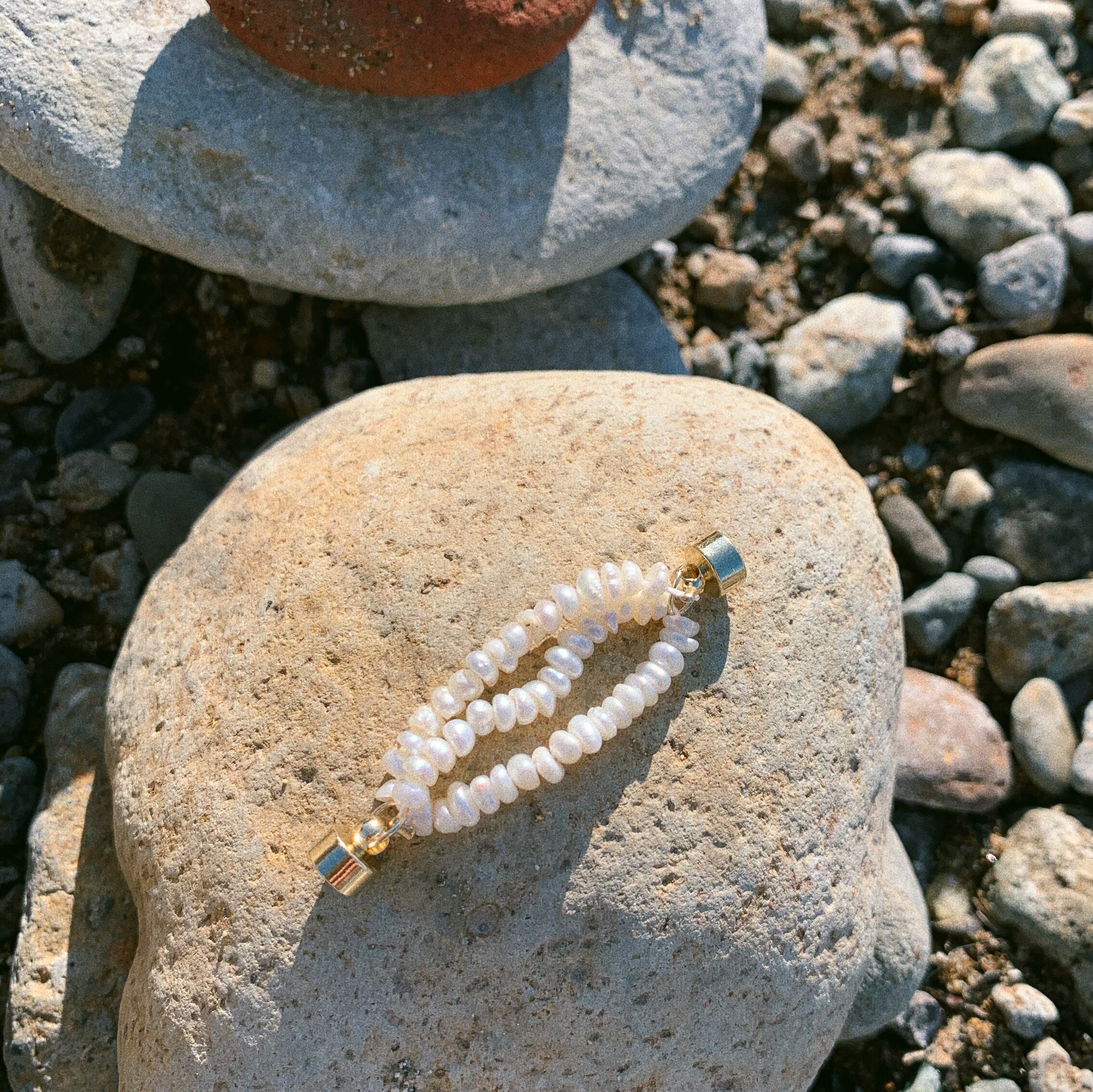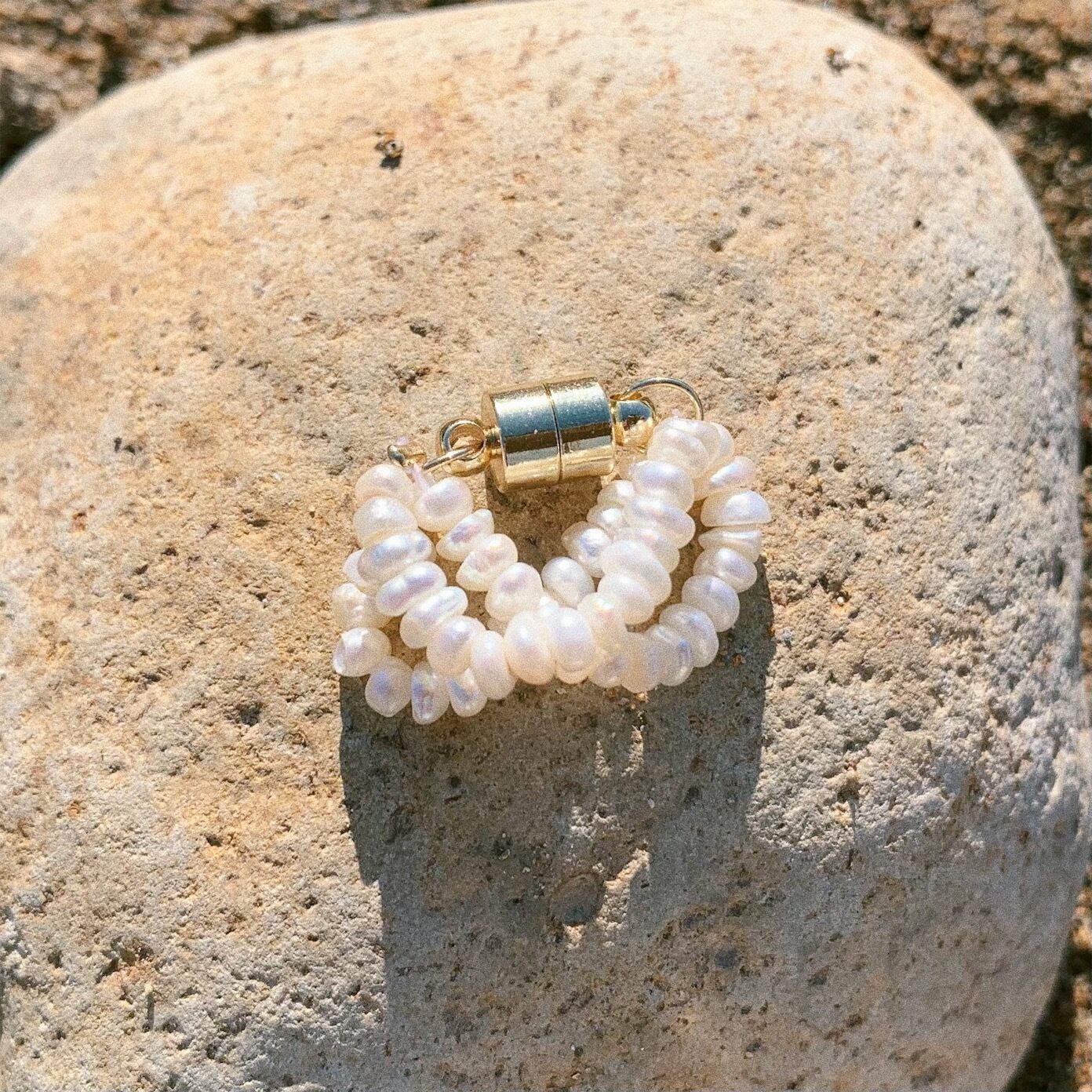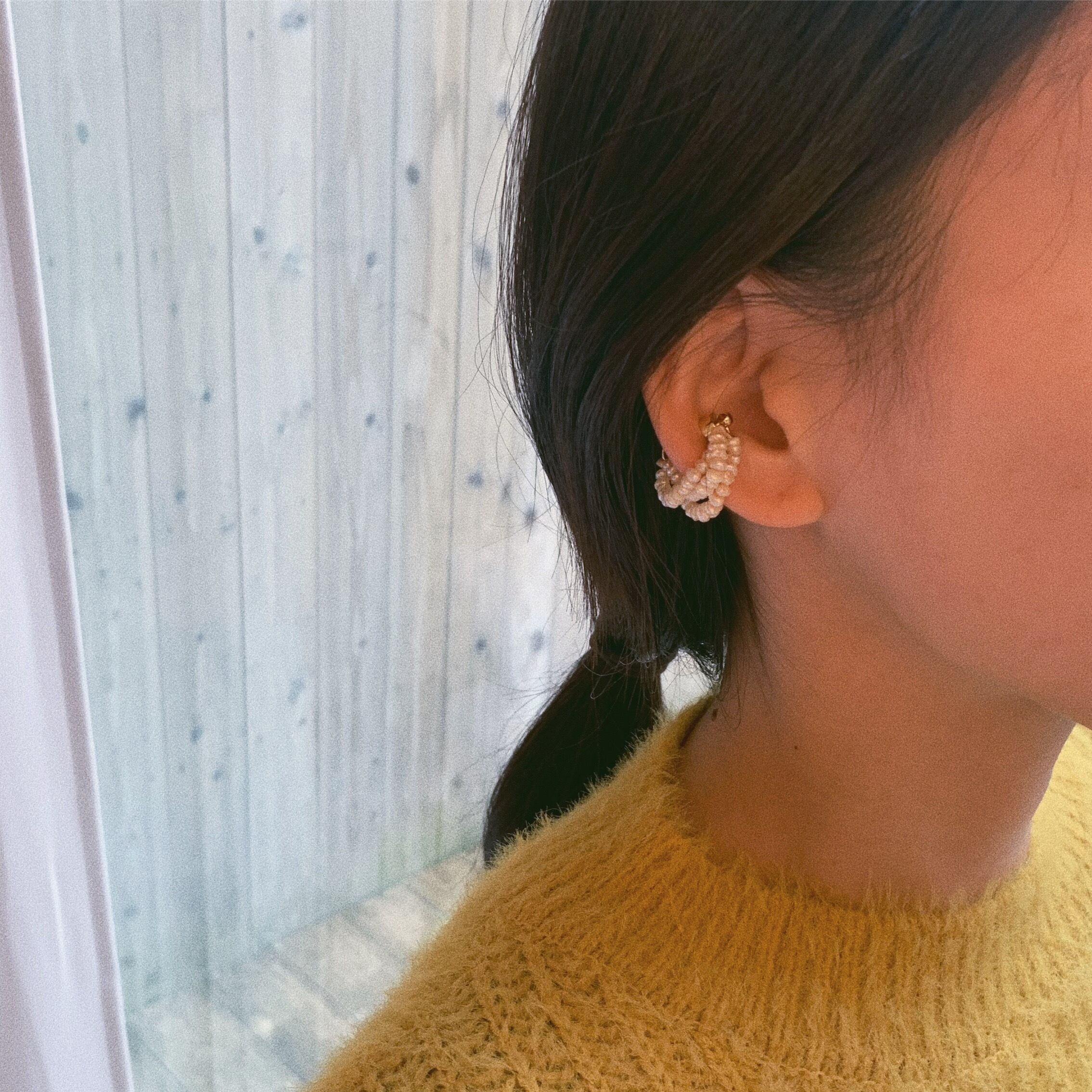 細かな淡水パール達が三連に連なったマグネットタイプのイヤーカフ。